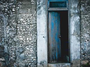 Blue door and concrete wall mixed with coral. Malé, Maldives