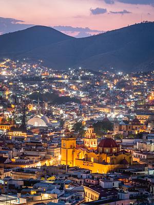 The capital city (Guanajuato) illuminated at dusk. Guanajuato, México