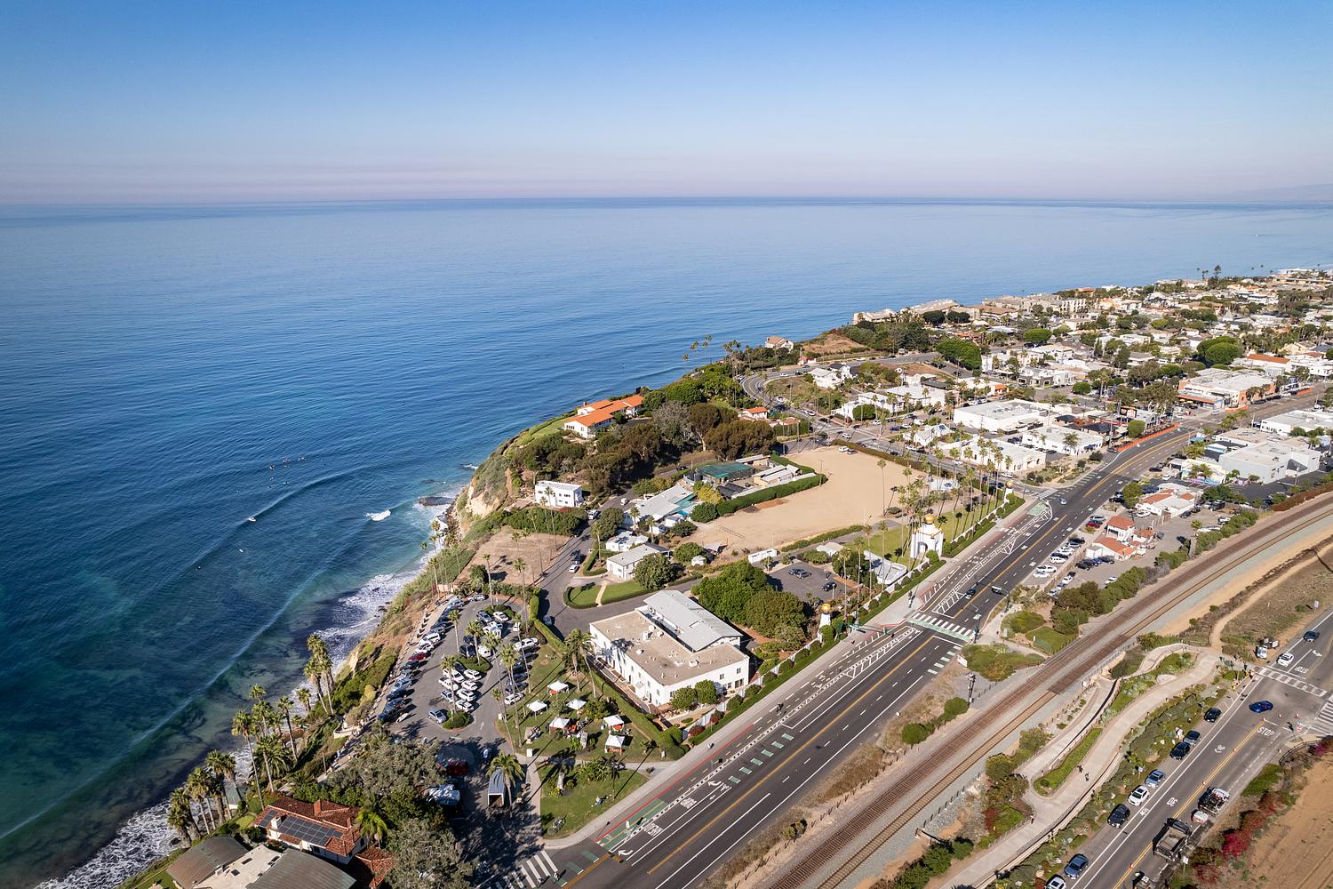 An aerial perspective of the Encinitas coastline, including Swami's beach and the Coast Hwy 101. San Diego, California